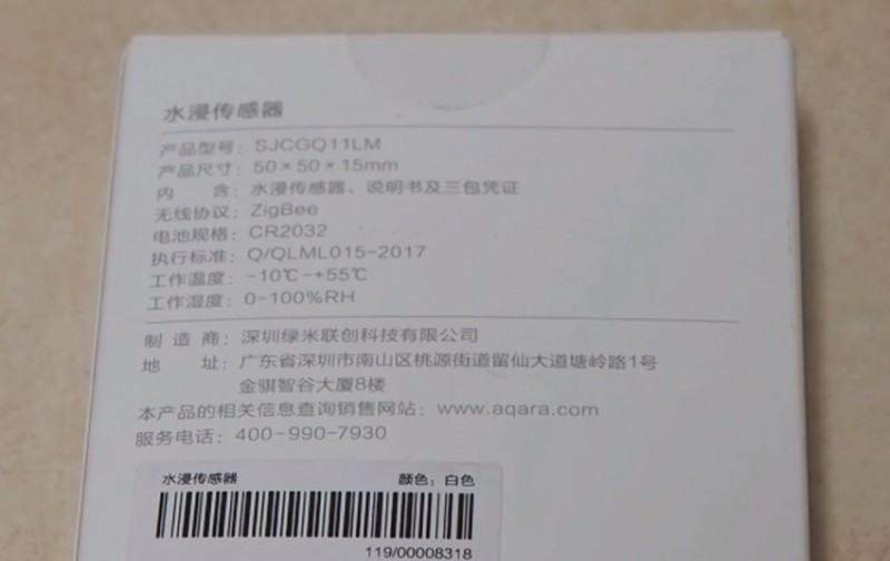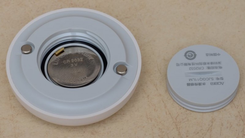 The sensor looks like a wireless Xiaomi Mijia button in its design, but with a droplet.Behind the device there are two contacts- for the flooding identification and the battery compartment.The CR2032 battery is hidden behind a screw cap, with a rubberized plug