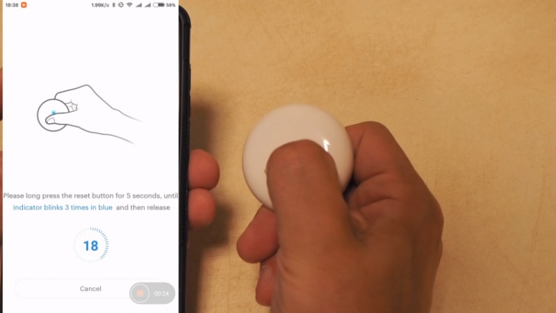 The connection is made using the standard method, via the gateway management plug-in and the device tab. The sensor not only looks like a button – it contains it, just under a droplet. This is a pairing button – which must be pressed for 5 seconds, until the blue LED starts flashing, which is invisible under the top layer when turned off.