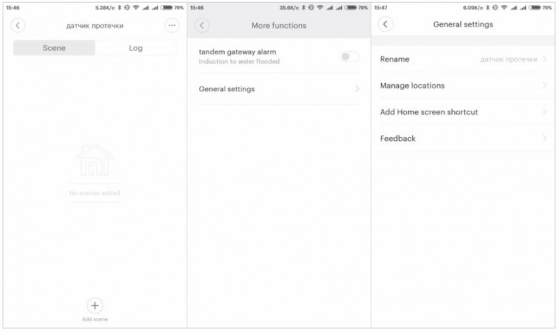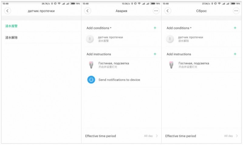 The sensor can serve as a condition in the scenarios and has 2 options for action – in Chinese. The first option is a leak detection, the second one is the leak has been eliminated.