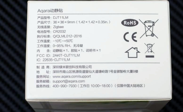 The sensor works using ZigBee protocol, It is powered by CR2032 element and has size of 36 * 36 * 9 mm. In addition to the sensor, there is an extra sticker of the double-sided adhesive tape and multylingual instruction.