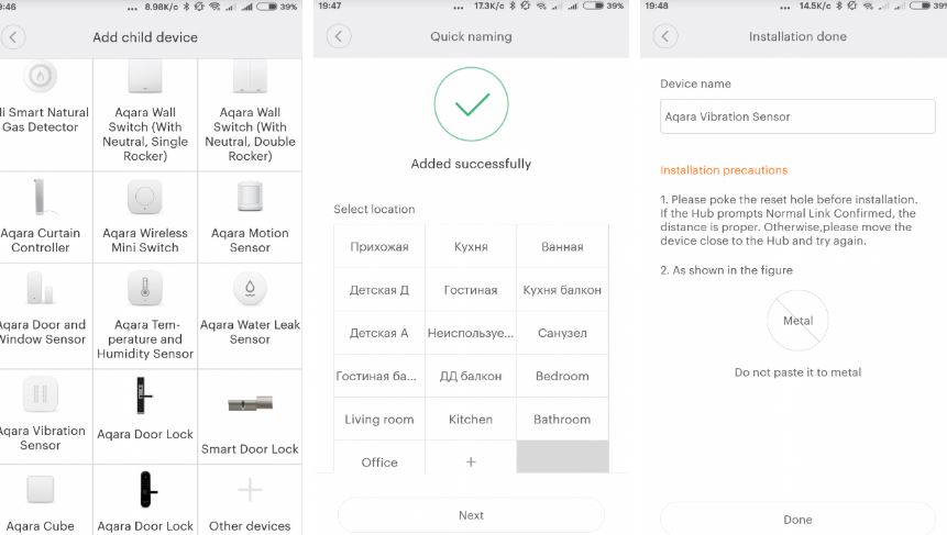 The sensor is connected in the MiHome application directly or through the gateway plug-in. Gateway, Aqara and Mijia – it does not matter. The sensor has standard wizard – select the desired sensor from the list, press and hold the sensor button until 3 diode flashes appear,and select the room in which the sensor will be installed.