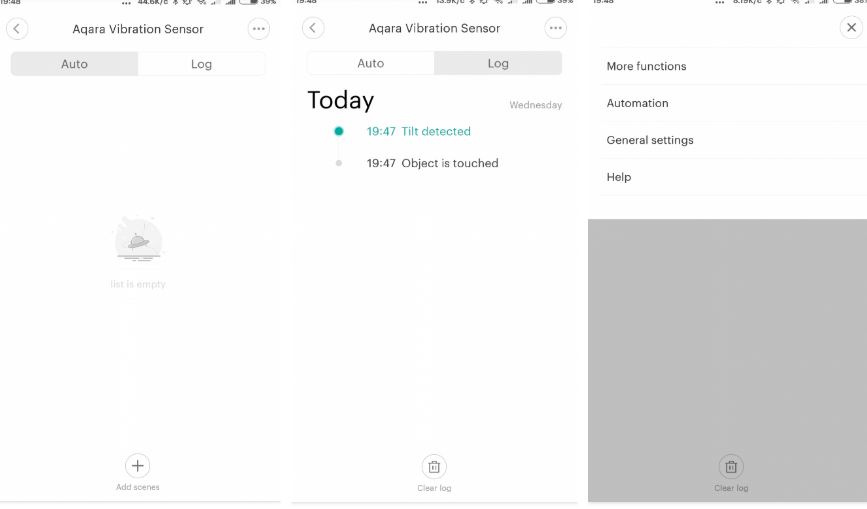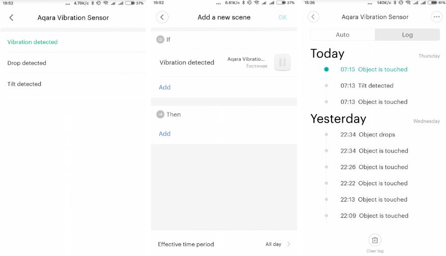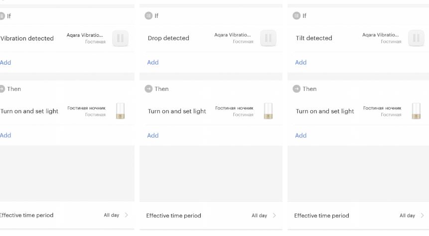 The sensor plug-in has two standard windows – one of the window has a list of scenarios in which the sensor is involved, the second one has a trigger log. All other things are in the menu. Regarding the exclusive information, the sensor menu can provide for the statistical vibration curve data, the data appear not to be updated by day and by week yet, so I do not understand their meaning. There is also an adjustable sensitivity level, the default sensitivity level is medium. If you need to change it – it’s better to select it experimentally depending on the tasks, then after selecting the level, you need to press the button on the sensor and get a voice confirmation from the gateway.
