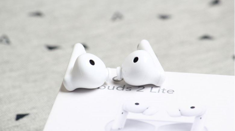 The Earbuds 2 Lite shells are made of the exact same glossy plastic. The earbuds are non-standard, oval, and short. On the sound tube there is a rim for a more secure attachment of the nozzles, there is a protective cloth mesh. On the inside there are two charging contacts and two microphone holes. Here you can see an additional compensation hole and the marking of the left and right channels.