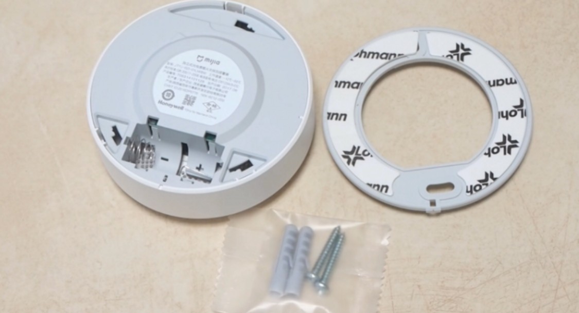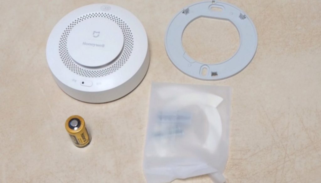 In addition to the smoke detector, there is a battery CR123A, a plastic wall mount – to attach the detector to and a set of fasteners – a pair of screws and a double adhesive tape.