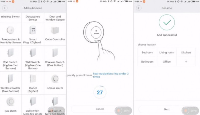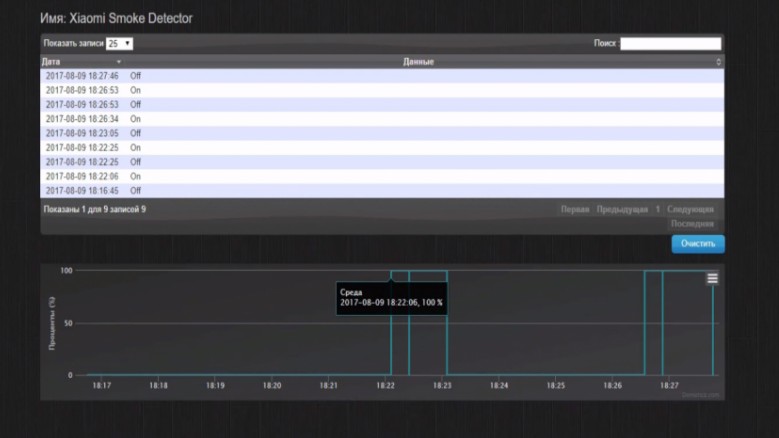 The cconnection process takes place according to the similar patterns: we start the gateway plug-in, select the detector from the table, press the button, and a minute later we have a connected smoke detector.
