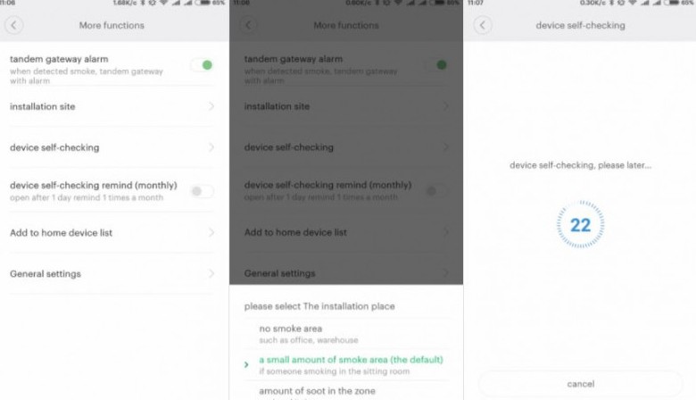 The “tandem gateway alarm” function can be deactivated in the addition settings menu – It is a function that activates the alarm at the gateway immediately with detector’s actuation. You can set the area of the detector’s location for the maximum sensitivity– the area without smoke, or you can set the middle area(by default) where you can smoke a cigarette, and you can also set the area of the least sensitivity- like a kitchen, for example.