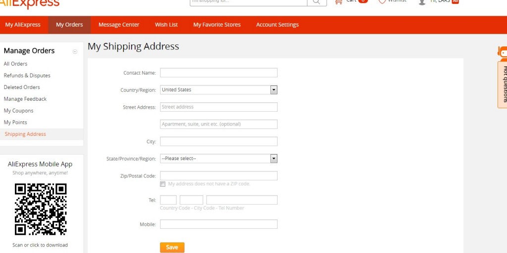 Осталась одна важная вещь- адрес доставки,его можно будет указать при оформлении заказа,так и через настройки вашего аккаунта. Для этого нужно перейти к управлению вашими заказами My Orders