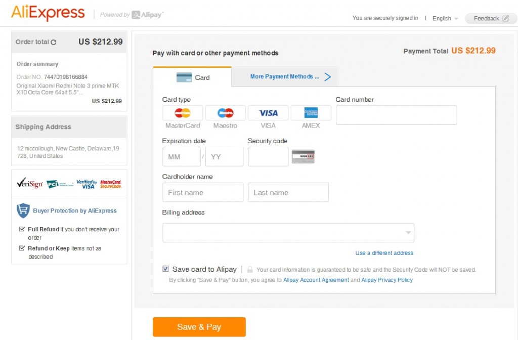 Если вы правильно указали ваши платежные реквизиты то после нажатия кнопки Save&Pay получите сообщение о том, что AliExpress получил ваш платёж.