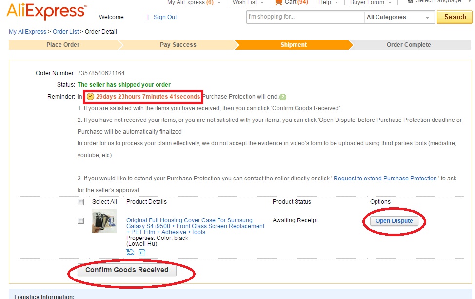 Если же срок доставки подходит к концу,а вы не получили ваш заказ (советуем сделать это за 4-5 дней до окончания срока) или же получили брак,не соответствующий описанию товар и.т.д, то вам нужно будет перевести заказ в состояние спора, нажав кнопку Open Dispute.