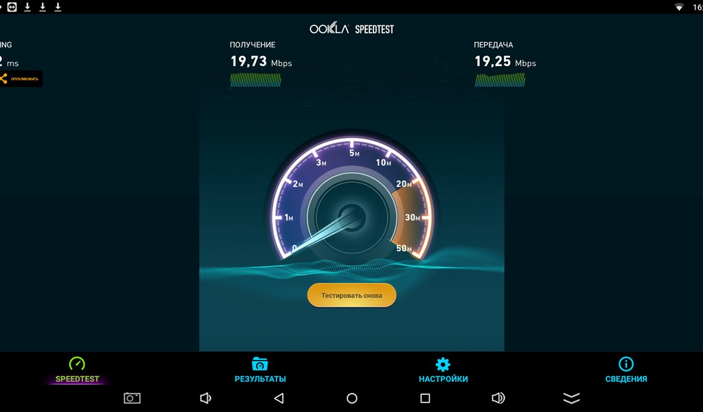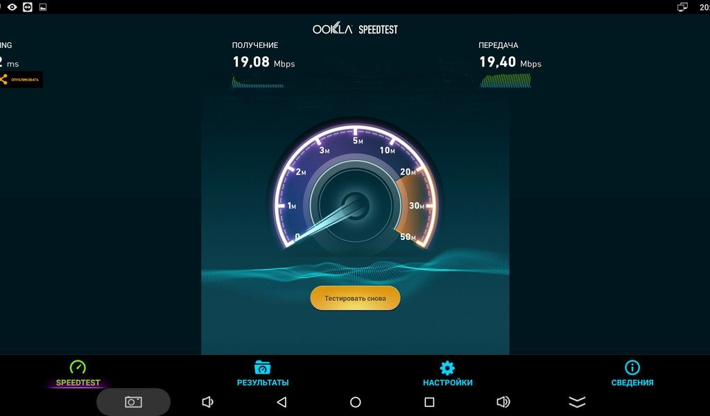 Nexbox A95x поддерживает подключение по кабелю на скорости до 100 Мбит и WiFi 2.4 Ггц 802.11n. Слабым местом китайских тв приставок всегда был Wifi,радиус действия не очень большой. В данной модели нельзя сказать чтобы работа WiFi была совсем ужасной. Если у вас роутер установлен в пределах прямой видимости, в нескольких метрах от приставки,то проблем с связью быть не должно.Тестирование показало идентичную скорость интернета как по WiFi так и по кабелю,при тарифе интернета 20 Мбит.