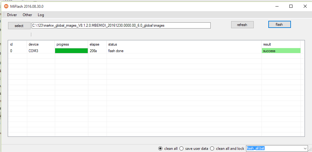 В MiFlash нажимаем кнопку Refresh. В колонке Device должен отобразиться тот же номер COM-порта, что и в Диспетчере устройств . в нижней части мифлеша выбираем и тыкаем на «clean all»