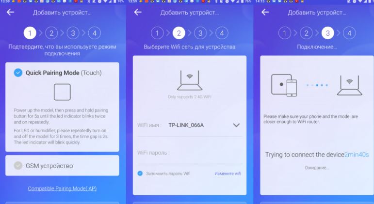 Let’s discuss initial connection procedure . First we should download EWlink application from Google Play or the App Store. After the launch, you need to add a new device, select the appropriate item and follow the instructions on the screen, namely the correspondence of the flashing point (the number of flashes and the period) in the application and on the outlet itself. To transfer the device to the pairing mode, it is necessary to hold the button for 5 seconds, then the flashes should become the same (equal) and if toy press the “Next” button, the application will tell you about the device found. The next step is an active WiFi network connection. After entering the password, you need to give a name to our outlet.