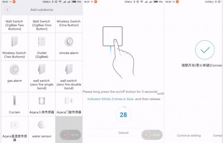 The connection is via the Xiaomi / Aqara gateway plug-in. We should go to the Devices tab – Add subdevice – we select the right switch here – zero fire and then we make connection using the prompts of the screen wizard.