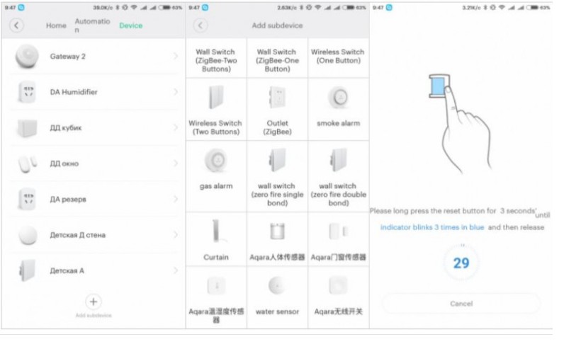 To connect the sensor, we should follow the same scheme – Xiaomi gateway plug-in, Add SubDevice, press the button on the side of the sensor and select the room and the icon.