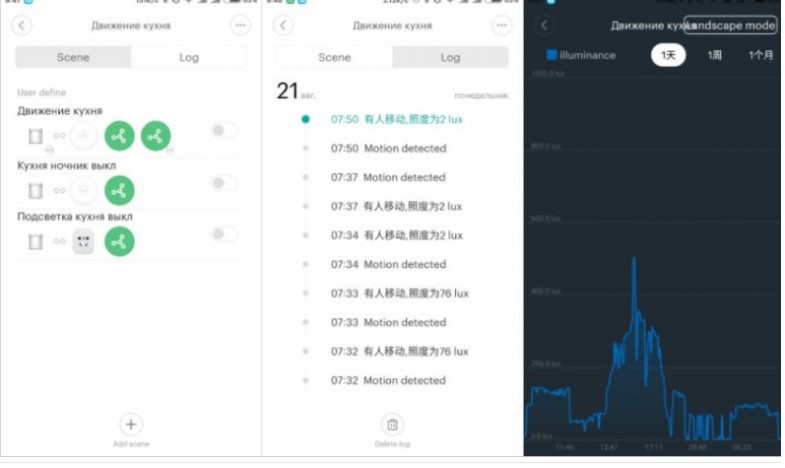 The sensor can only participate in the options (scenarios) as a condition, and besides the usual conditions such as the detection of motion and lack of movement for 2, 5,10, 20 and 30 minutes – it has one more condition – to detect the movement in the dark.