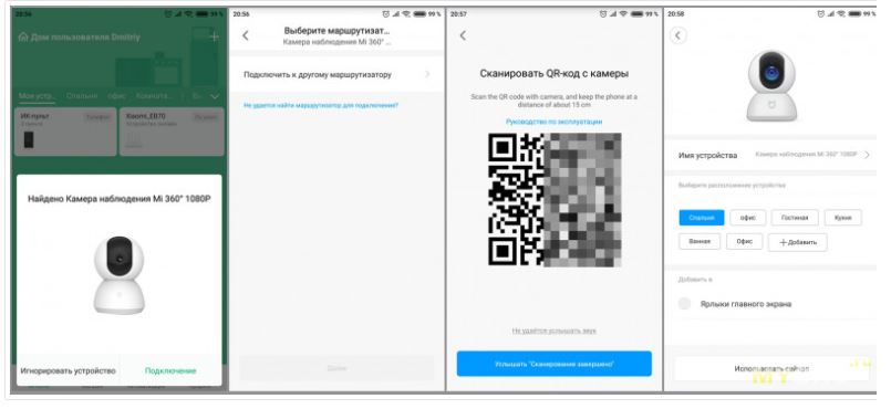 MiHome will automatically detect the camera and offer you to connect. When connected, you must specify a password to the selected WiFi network in MiHome. The application will display a screen with a QR code that needs to be shown in the camera lens.