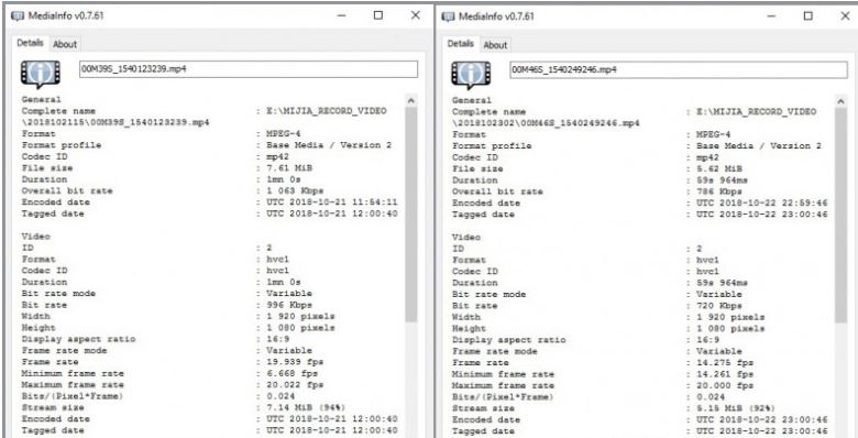 The camera shoots videos in MPEG-4 with a variable bit rate (VBR). In the afternoon it records at the 1920×1080 resolution with 19.9 to 20 fps , at night – 1920×1080 from 14 to 20 fps